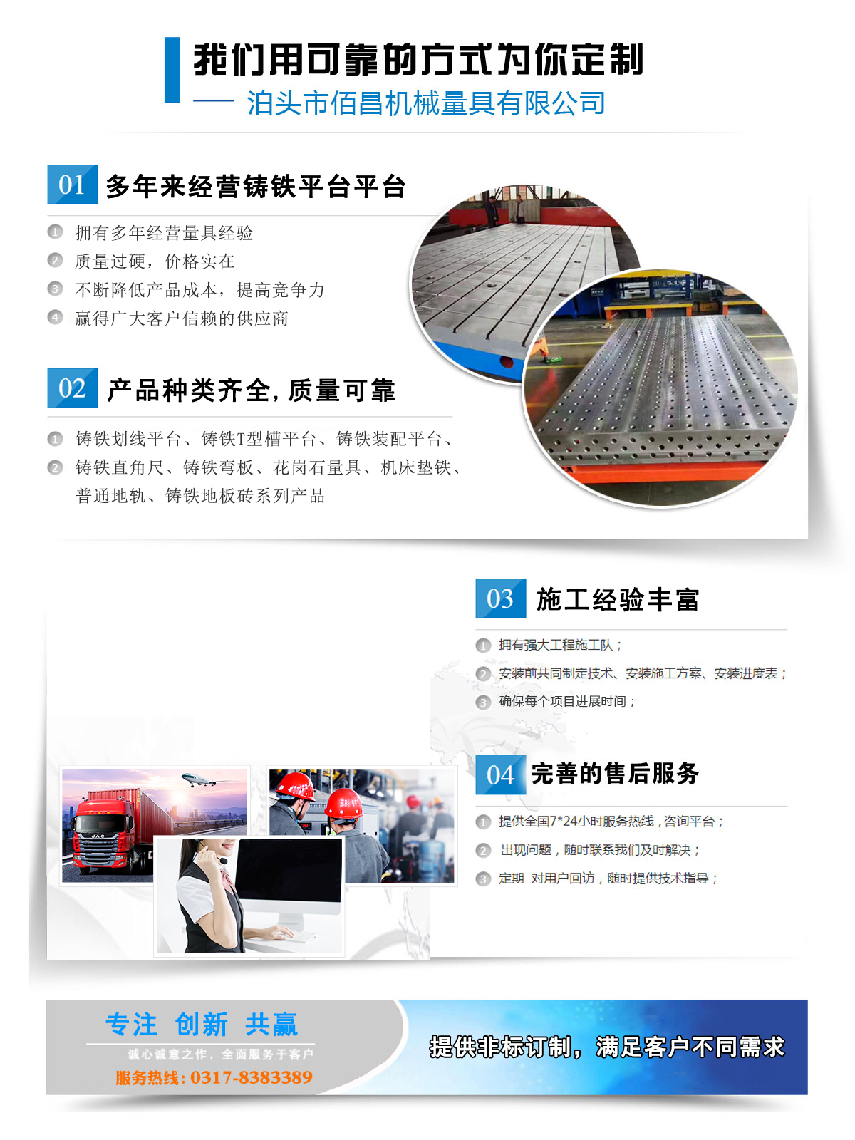 泊頭市佰昌機械量具有限公司坐落在有“鑄造之鄉”美稱的泊頭市,我公司自創建初期堅持誠信原則和不斷創新的原則,_為廣大用戶提供鑄鐵平板,鑄鐵地板,劃線平臺等放心產品,我們的產品_程度高,得到了廣大用戶的高度認可。